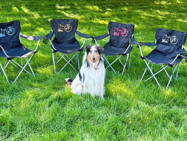 Only one of these beautiful chairs is left in stock! It has gold embroidery (pictured behind and to the left of Izabelle, the Collie) and features the ISSO and ISA logos. A custom magazine pocket was added to the backrest.